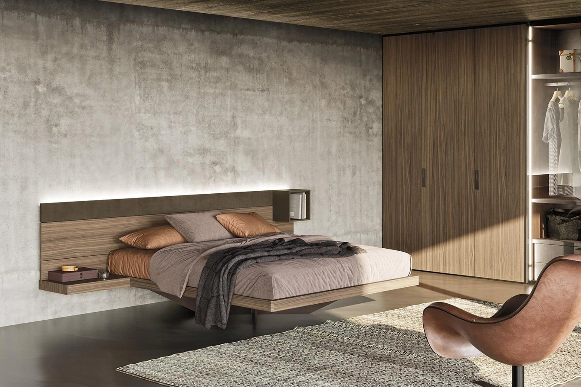 Se desideri una soluzione in legno, il modello mostrato in foto è caratterizzato da materiali pregiati e linee decise, che invitano a passare un riposo tranquillo e ristoratore. Scegli cromie e finiture e realizza il tuo progetto d’arredo nella camera da letto, progettandola proprio come l'hai sempre immaginata. Il Letto matrimoniale Wall System N06 di Mobilgam ricrea uno spazio accogliente e confortevole in ogni camera da letto, assicurandoti il relax totale e un design unico. I Letti matrimoniali con testiera del brand, leader nella realizzazione di Proposte d’arredo per la zona del riposo, sono pensati per essere abbinati a mobili e complementi di ogni tipo, come armadi e comodini, lampade e piantane.